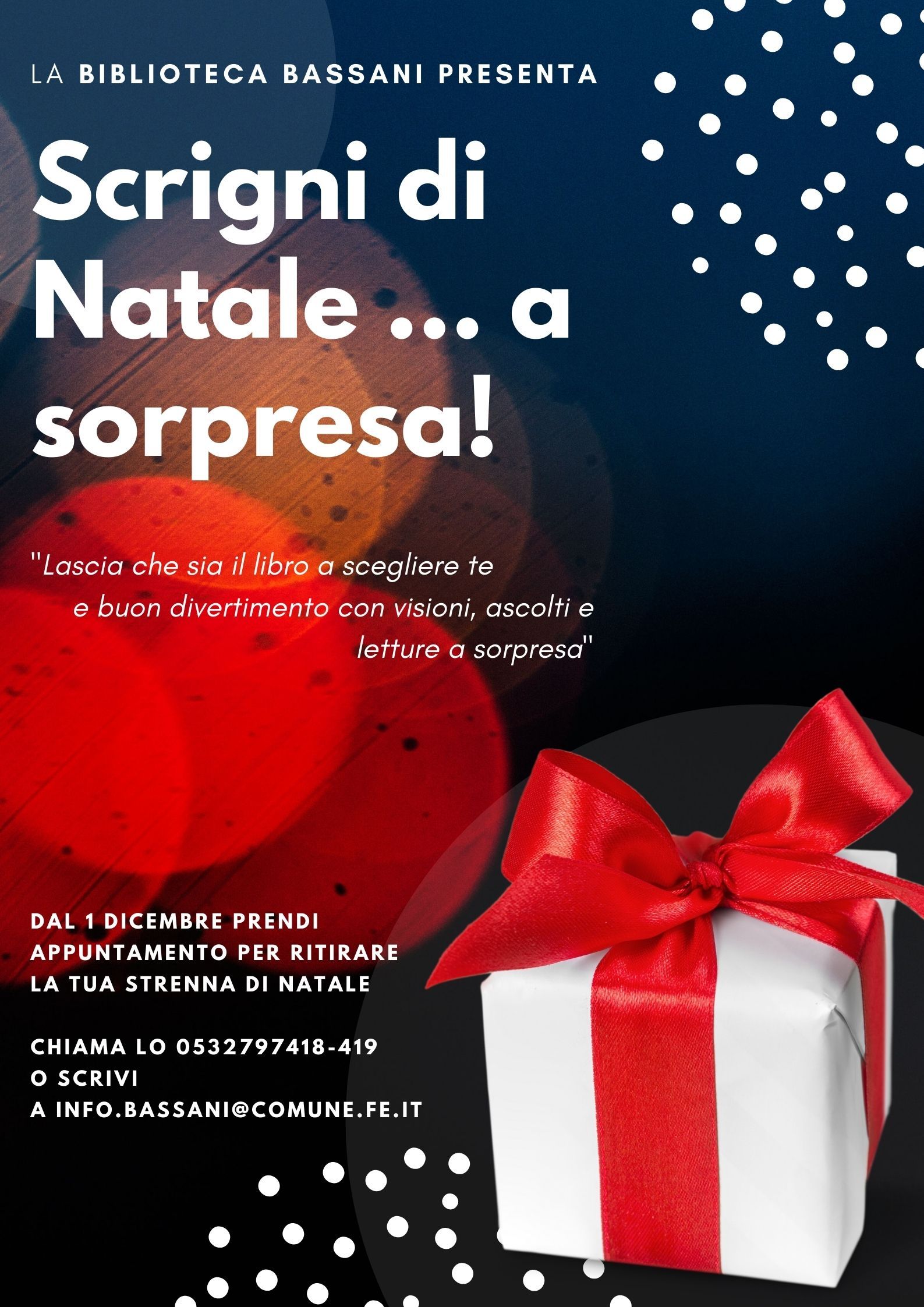 Alla biblioteca comunale Bassani di Barco (Ferrara) è tempo di ‘appuntamenti al buio’ con la lettura. Per tutto il mese di dicembre 2020 i lettori di tutte le età potranno infatti partecipare all’iniziativa ‘Scrigni di Natale a sorpresa!’, scegliendo fra i tanti diversi pacchetti tematici, per bambini o per adulti, messi a disposizione per il prestito ed esposti nella vetrina della biblioteca. Ogni pacco a sorpresa contiene libri, film, musica e audiolibri su innumerevoli argomenti, per soddisfare le curiosità e le passioni più diverse. Tra i tanti temi fra cui scegliere: ‘Famiglie sotto l’albero’, ‘Avventure miracolose di Natale’, ‘Letture per quando si ha il raffreddore’, ‘Letture per sembrare colti’ e ‘Libri per bambini che non vogliono andare a dormire’ (l’elenco completo degli argomenti sul sito https://archibiblio.comune.fe.it).